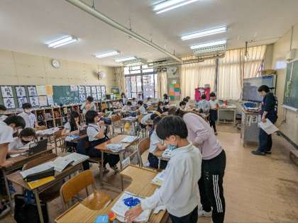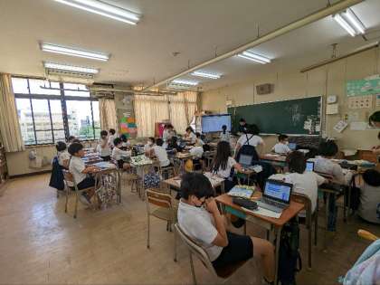国語の授業の様子です。パソコンを使って調べ学習をしていました。学習のいろいろな場面で、普通にICT機器が使われています。