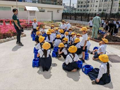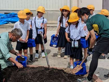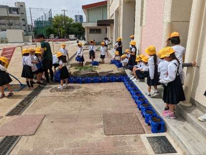 生活科の授業の様子です。朝顔の種まきをしていました。管理作業員さんと担任の先生から植木鉢に土を入れてもらい種をまきました。教室前に並べて水やりをしました。毎日しっかり世話をして、立派な花を咲かせましょう。