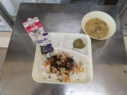 今日の献立は、かやくご飯・みそ汁・抹茶ういろう・牛乳です。