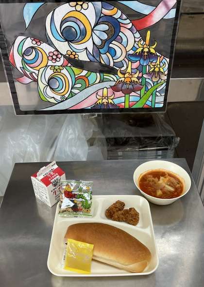 今日の給食は、コッペパン、アプリコットジャム、牛乳、一口トンカツ、ミネストローネ、豆こんぶです。ミネストレーネは、イタリア語で「具だくさん」という意味で、たまねぎやにんじん、トマトなどの野菜が入ったスープのことを言います。今日の給食では、鶏肉とキャベツ、たまねぎ、トマトなどの野菜が使われています。