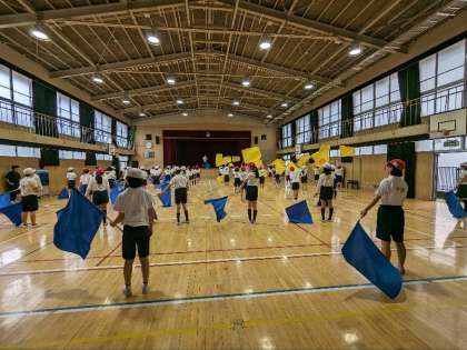 運動会の団体演技の練習の様子です。力強くフラッグを振る音が講堂に響いていました。とても迫力がありました。ポーズも決まっていました。本番が楽しみです。