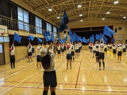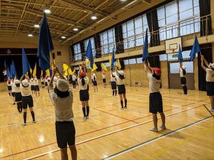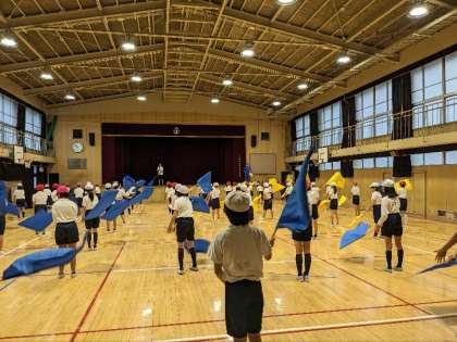 運動会の団体演技の練習の様子です。雨がひどく運動場が使えないので講堂で練習していました。旗を振るときの音が講堂中に響いていて、とても迫力がありました。さすが中道の高学年です。