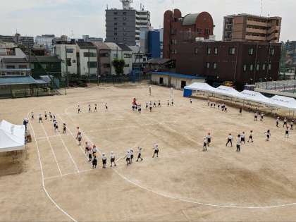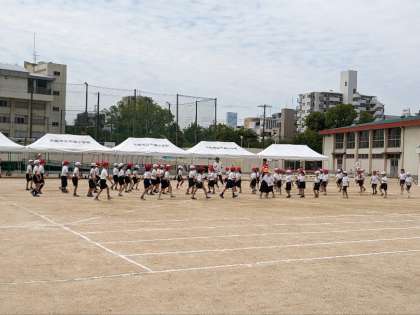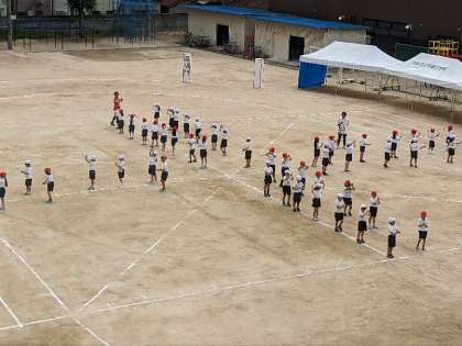 運動会の団体演技の練習の様子です。運動場で隊形の変化を確認しながら踊っていました。自分の演技場所と移動先もきちんと覚えましょう。運動会まであと6日ですがんばりましょう。