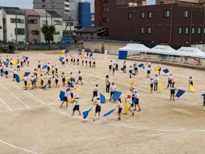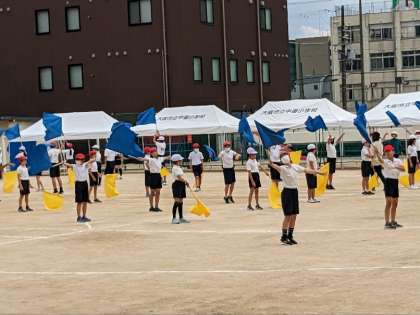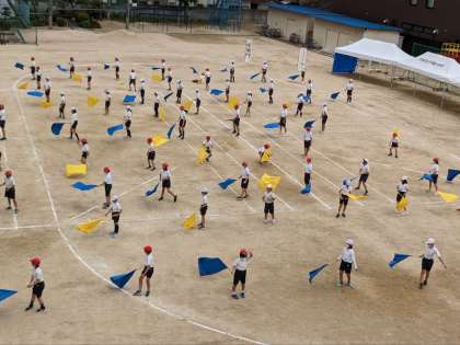 運動場場で、団体演技の練習を行いました。気合を入れて旗を振る姿が勇壮です。隊形移動もばっちりでした。当日は高学年のかっこいい姿を、皆さんに見てもらいましょう。
