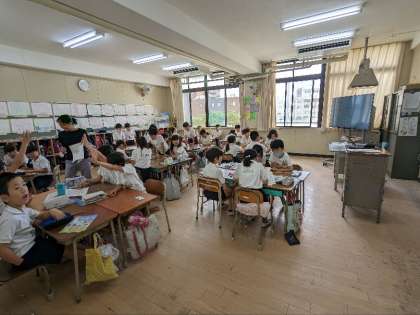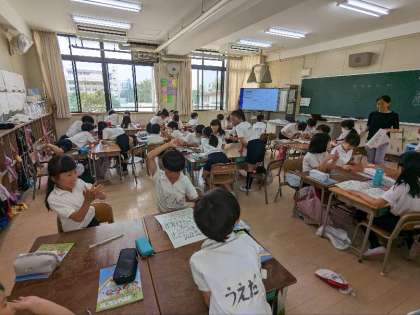 外国語活動の様子です。数探しクイズをしていました。1枚のプリントの中に、同じ生き物絵がいくつ描かかれているかを探すクイズでした。見つけた数を英語で答えていました。子ども達は、指示された生き物を一生懸命に英語で数えていました。