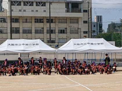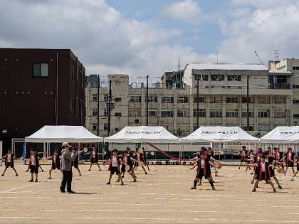 運動会の団体演技の練習の様子です。天候の回復を待って、当日の衣装を着てパーランクーを使って練習しました。勇壮でとても迫力がありました。当日の演技を期待していてください。
