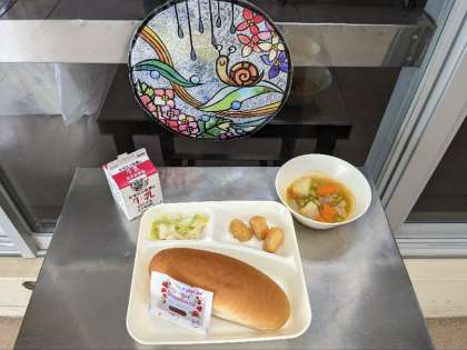 今日のメニューは、いか天ぷら・フレッシュトマトのスープ煮・キャベツとコーンのソテー・コッペパン・イチゴジャム・牛乳です。
