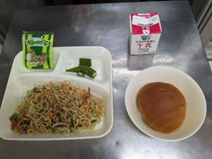 今日のメニューは、和風焼きそば・オクラの甘酢あえ・抹茶大豆・黒糖パン・牛乳です。