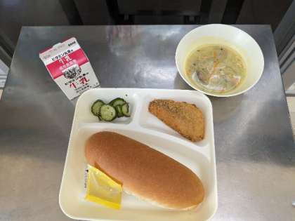 今日のメニューは、サーモンフライ・豆乳スープ・きゅうりのバジル風味サラダ・コッペパン・アプリコットジャム・牛乳です。