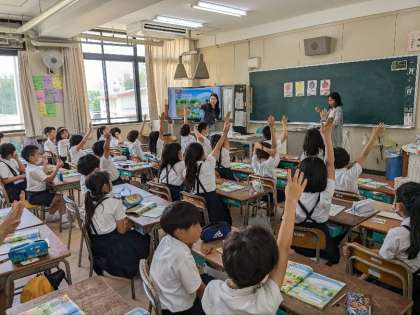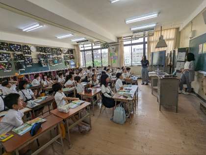 外国語活動の授業の様子です。色の学習をしていました。知っている色を、英語で発表していました。イエロー・パープル・ブラウン等。中には、スカイブルーと発表した子もいました。皆さんはわかりますか?「そらいろ(明るい青)」だそうです。