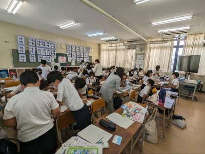 英語の授業の様子です。パソコンを使って外国のことを調べていました。1つ国を決めて、英語で発表するようです。どの国をどのように発表するのか興味がありますね。楽しみです。