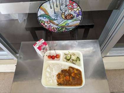今日の献立は、ハヤシライス・ミックス海そうのサラダ・さくらんぼ・牛乳です。
