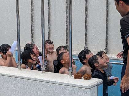 続いて、ドキドキワクワクしながら、シャワーを浴びました。日差しもあり寒くはなかったです。入水し、音楽に合わせて水遊びをしました。あちこちから嬉しそうな歓声があがっていました。