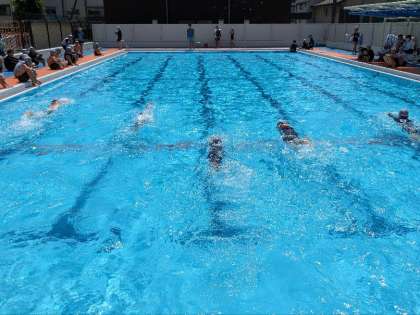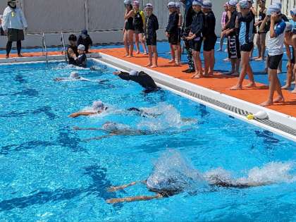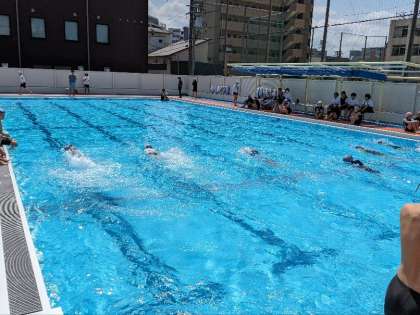 水泳の授業の様子です。真夏を思わせる天気で、今日は入っていて気持ちがいいです。 泳力を測りました。9月には、今日よりも大きく伸ばせるように、目標をもってがんばりましょう。
