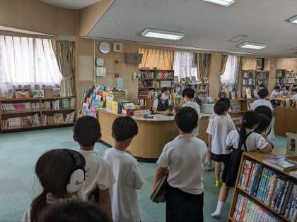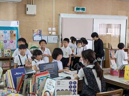 急な雨でプール学習が中止になりました。3じかんめは、読書活動になりました。借りた本の返却の様子です。いまは、パソコンで本の管理をしています。バーコードを読み取るだけで借りたり返したりできます。こんなところにもICT機器が導入されています。便利になりました。