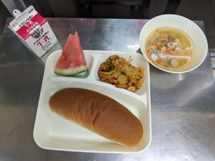 今日のメニューは、パエリア・ウインナーとキャベツのスープ・すいか・黒糖パン・牛乳です。