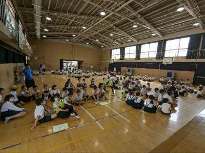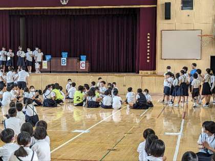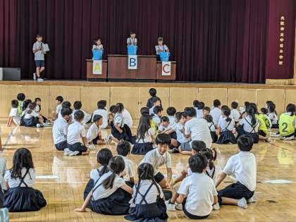 講堂で児童集会を行いました。今日は、どのバケツに水が入っているかを当てるクイズでした。難しかったらしく、全問正解した班はなく、5問正解した班が1つだけでした。みんなから温かい拍手が送られました。