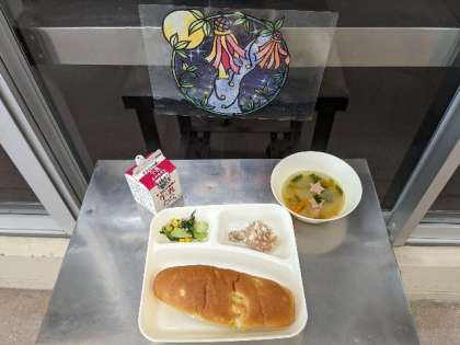 今日は、七夕です。スープのハムは、星形に、掲示物も七夕飾りと天の川になっています。ロマンチックですね。