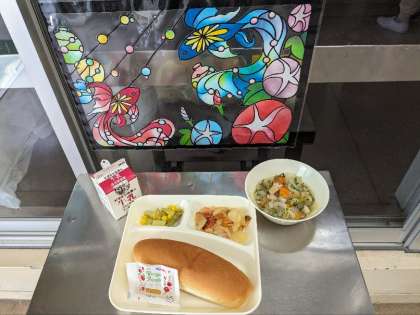 今日のメニューは、鶏肉とてぼ豆のスープ煮・じゃがいもとトマトのチーズ焼き・グリーンアスパラガスとコーンのサラダ・コッペパン・りんごジャム・牛乳です。
