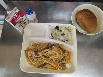 今日のメニューは、チキントマトスパゲッティ・発酵乳・キャベツのひじきドレッシング・黒糖パン・牛乳です。