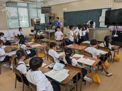 学級活動の授業の様子です。夏休みの宿題を点検していました。昨日までがんばって仕上げた宿題を調べていました。子ども達は、コンクール等に出品する作品もたくさん提出していました。入賞するといいですね。