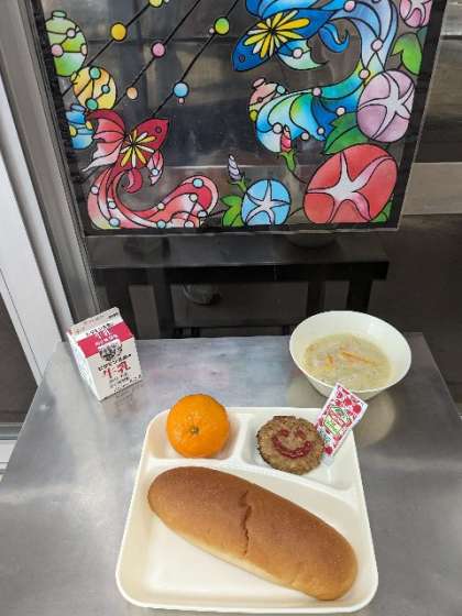 今日のメニューは、焼きハンバーグ・豆乳スープ・みかん(冷凍)・黒糖パン・牛乳です。焼きハンバーグは味もよく食べるとじゅわーっとして、スープは絶品の味でした。冷凍みかんは、なにもいうことはありません。