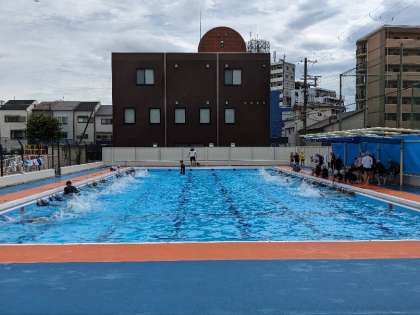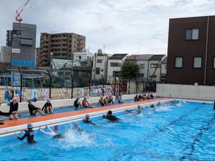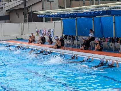 体育の授業の様子です。休み明け1回目の水泳の学習でした。バタ足の練習をしていました。1学期の復習ですね。基本的な動きを確かめて、しっかりと足を延ばしてバタ足をしていました。