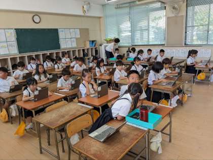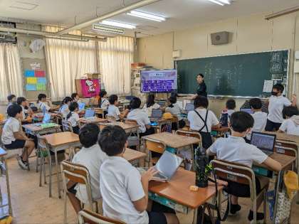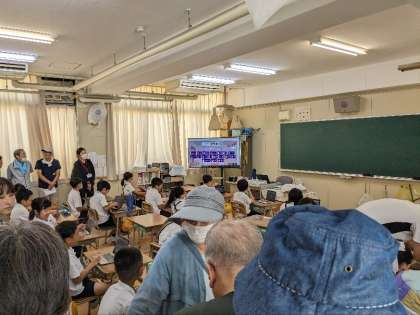 本日、地域・保護者・学校が共同で防災訓練を行っています。連合町会長さんのお話・校長先生のお話に続いて、各学級で防災クイズを行いました。ちいき・保護者の皆さんにパソコンを使ってクイズの答える様子を見てもらいました。