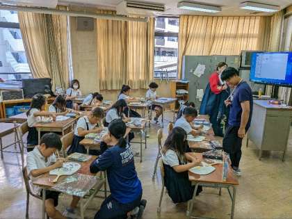 2学期最初の民族クラブの活動の様子です。うちわの色付けを行いました。ていねいに思い思いの色を使って塗っていきました。来週には完成の予定です。できたら持って帰りますので家で大切に使いましょう。