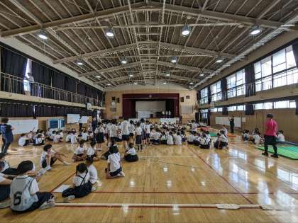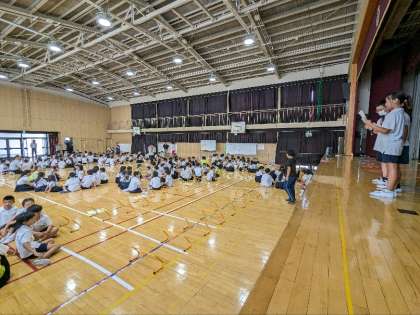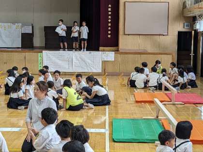 講堂で児童集会を行いました。今日は、お題当てクイズでした。集会委員会の出すお題を当てるクイズです。6問ありましたが、全問正解をした班は、ひとつの班だけでした。みんなから称賛されました。