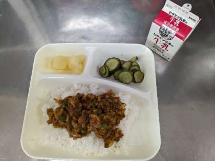 今日の献立は、大豆入りキーマカレーライス【米粉】・きゅうりのサラダ・洋なし(カット缶)・牛乳です。キーマカレーには粉砕された大豆と豚レバーが入っていてそれが味のアクセントとなって、とってもおいしかったです。きゅうりのサラダは、カレーによく合うんです。洋なしもシャクシャク感があって、これもカレーによく合いました。