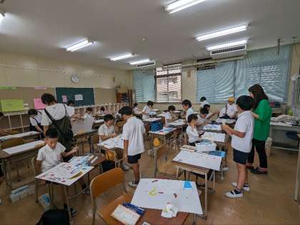 図画工作科の授業の様子です。下絵に絵の具で着色していました。想像で描いた山がどんな色で塗られていくのでしょうか。ていねいに仕上げましょう。