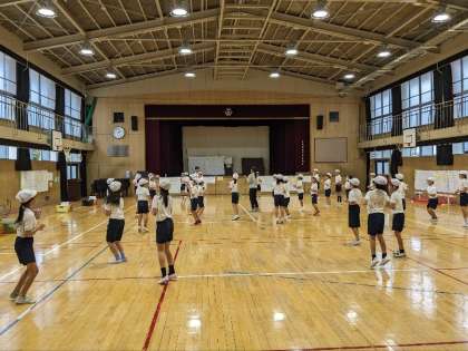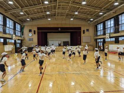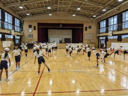 体育の授業の様子です。講堂で、曲に合わせて準備体操をしていました。ぴょんぴょん跳んでバランスを取りながら、体操をしていました。リズムに乗ってノリノリで、とっても楽しそうでしたよ。