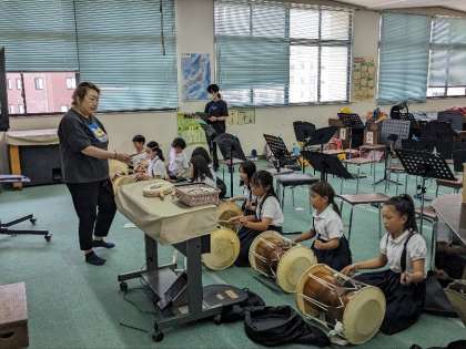 民族クラブの活動の様子です。先週に続き、うちわのデザインをしました。みんなオリジナルのうちわを完成させました。個性豊かで素敵なうちわです。続いて音楽室で、楽器の練習をしました。今度の発表会で演奏します。しっかり練習をして上達しましょうね。