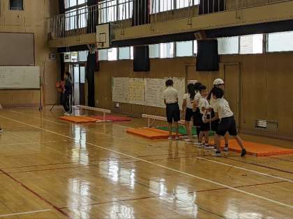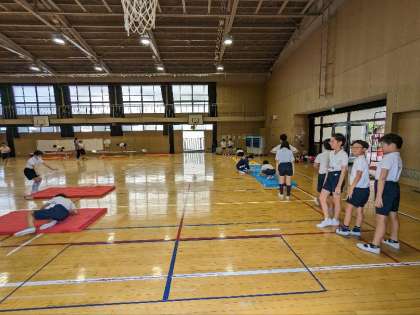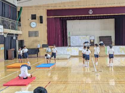 体育の授業の様子です。体づくりの運動をしていました。跳んだり・回転したり・バランスをとったりと、いろいろな運動にチャレンジしていました。総合的な運動能力を伸ばすためにがんばりましょう。