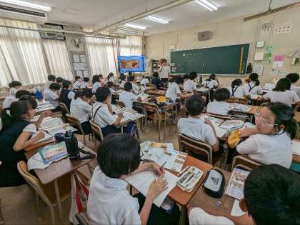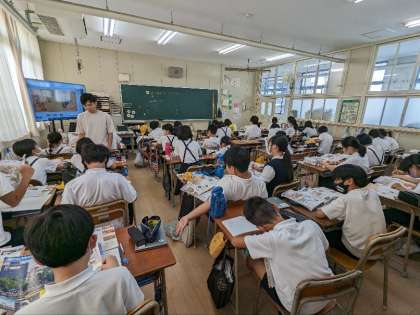 社会科の授業の様子です。鎌倉時代の歴史を学んでいました。画像には元寇の様子が映っていました。皆さんも見られたことのある絵です。懐かしいですね。