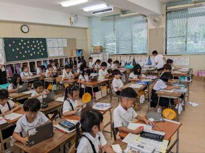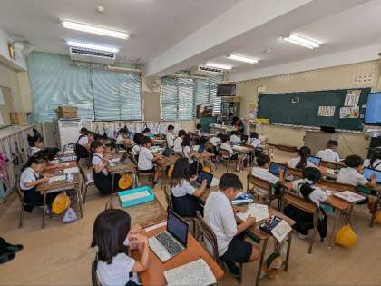 算数の授業の様子です。計算のプリントにチャレンジしていました。早くできた子は、パソコンを使って学習していました。すごいですね。