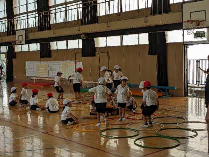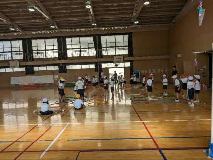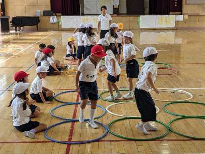 体育の授業の様子です。講堂で、跳ぶ・跳ねる運動をしていました。グループに分かれて曲に合わせて、リングの中でリズミカルに跳んでいました。