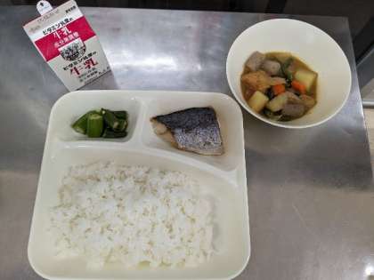 今日の献立は、さごしの塩焼き・含め煮・オクラのいためもの・ごはん・牛乳です。