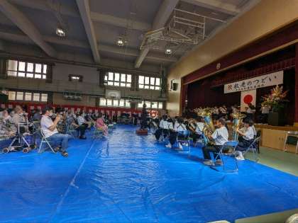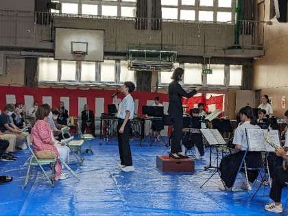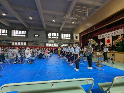 第2部では玉津中学の吹奏楽部のコンサートがありました。懐かしい昭和歌謡のメドレー曲やマイウエイやマツケンサンバ2も披露され、歌も踊りもありすごく盛り上がりました。地域の皆さんは、大喜びされていました。