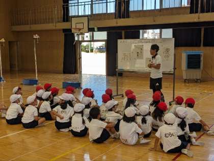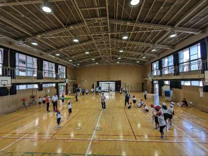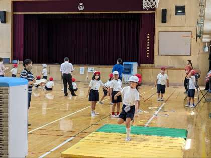 体育の授業研究会を講堂で行いました(走・跳の運動)。多くの先生たちが見ている中、子ども達は、4つのグループに分かれていろいろなステージに挑戦していました。軽快な音楽に合わせて、目標をクリアできるようにがんばっていました。楽しくいっぱい体を動かす姿が、印象的でした。