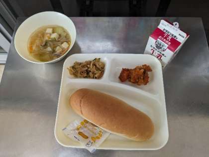 今日のメニューは、ヤンニョムチキン・とうふのスープ・切り干しだいこんのナムル・コッペパン・マーマレード・牛乳です。チキンは、ヤンニョムがよく効いていました。スープの味は、和食のみそ汁ではなく、和食のすまし汁でもなく、韓国風でした。切り干し大根も和食ではなく、韓国風でした。おいしかったです。