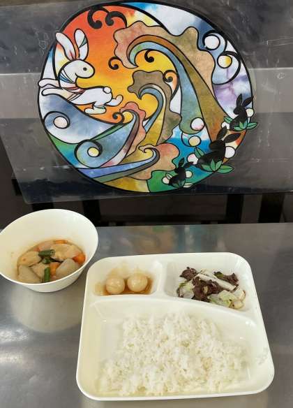 今日は、月見の行事献立です。旧暦の8月15日(今年は9月29日)は、「十五夜(じゅうごや)」「中秋(ちゅうしゅう)の名月(めいげつ)」と言われ、月が美しく見える日です。だんごやいもをそなえたり、すすきをかざったりして、お月見をします。今日の給食にも「みたらしだんご」「さといも」が登場しています。