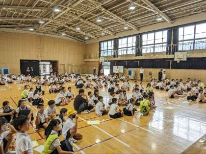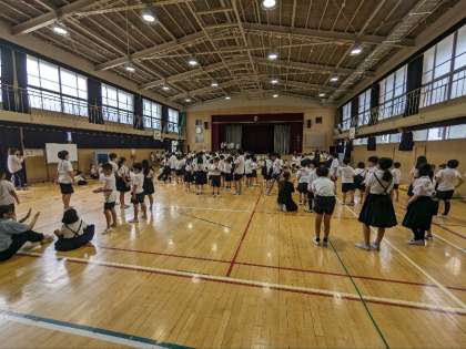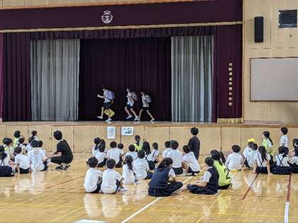 講堂で児童集会を行いました。今日のクイズは、「何人通ったでしょう」でした。舞台を行き来した人数を当てます。割と簡単だったので、多くの班が全問正解でした。正解した班には、賞賛の拍手が送られました。