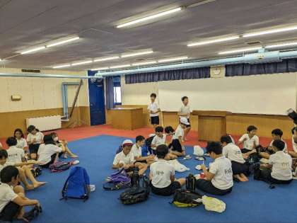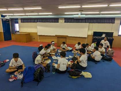 最初の食事の様子です。お弁当を、楽しんで食べています。いい天気ですが、クーラーのきいた部屋で食べています。