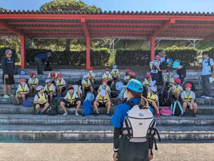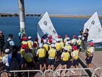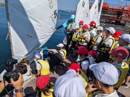 OPヨットの体験の様子です。乗り方の説明を受けています。