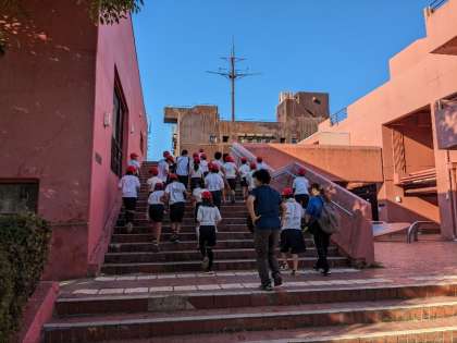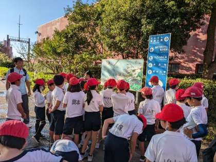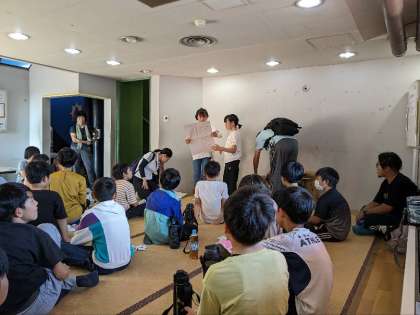 避難訓練の後、カレーの作り方を説明しています。この後、移動して飯盒炊さんです。