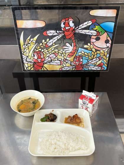 今日の給食は、鶏肉のてり焼き、かぼちゃのみそ汁、なすのそぼろいため、ごはん、牛乳です。日本でよく食べられているのは、西洋かぼちゃです。北海道や鹿児島県、長野県、茨城県です。体の調子を整える緑のグループの緑黄野菜です。