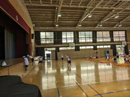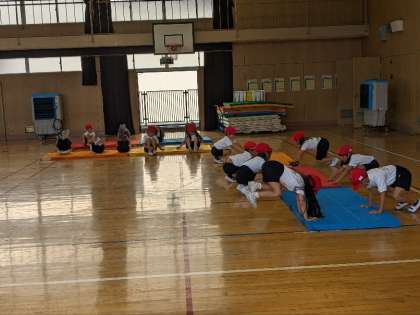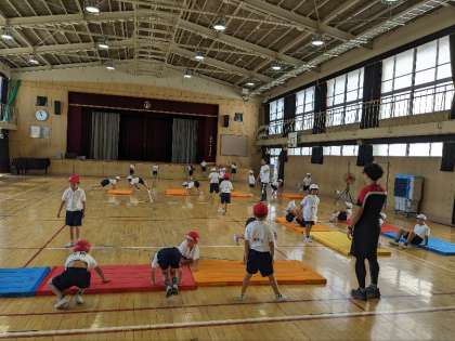 体育の授業の様子です。講堂で跳ぶ跳ねる運動をしていました。音楽に合わせていろいろな動きに挑戦していました。基礎的な動きを身につけて体力を伸ばしていきましょう。