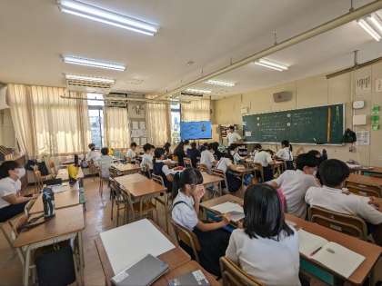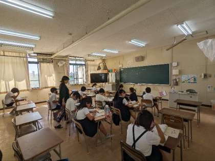 算数の授業の様子です。習熟度別少人数で学習をしていました。比の問題を解いていました。Xも出てきます。比をマスターしておくと、数学を考えるうえで絶対に武器になるので、しっかり身につけておきましょう。